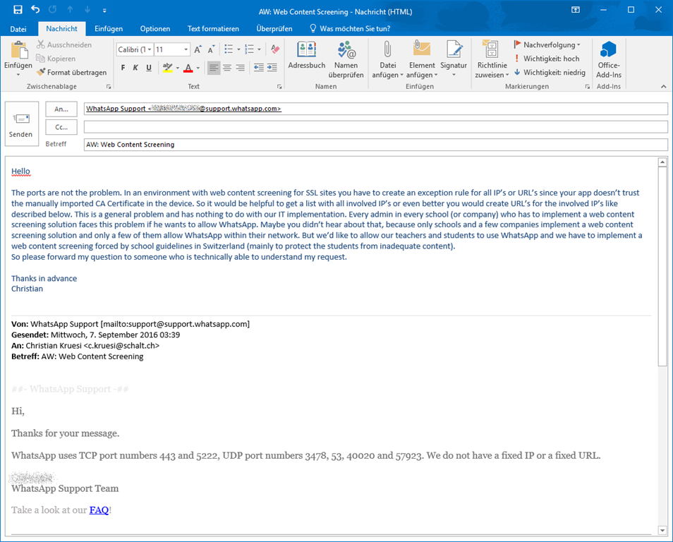 Da das Problem aber einfach zu lösen wäre, wenn WhatsApp DNS Namen für die verwendeten IPs benutzen würde, habe ich auch noch ein Mail an den Support geschickt. Mal schauen…