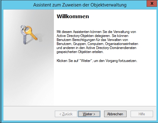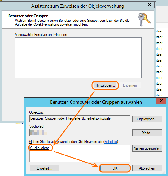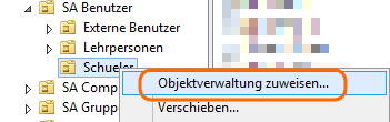 Zuerst muss man im Active Directory die entsprechende Berechtigung vergeben. Dazu macht man einen Rechtsklick auf die OU mit den Schüler/-innen und wählt “Objektverwaltung zuweisen…”.