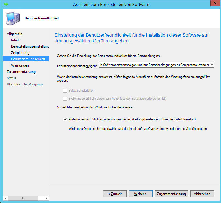 Hier wähle ich “Verfügbar”. Wenn man “Erforderlich” auswählt, öffnet sich der Store, sobald die Computerrichtlinie vom SCCM Client angewendet wird. Wenn man viele Apps so verteilt, poppt beim Benutzer dauernd der Store auf. Wenn man “Verfügbar” wählt, muss der Benutzer die App aus dem Softwarecenter installieren.