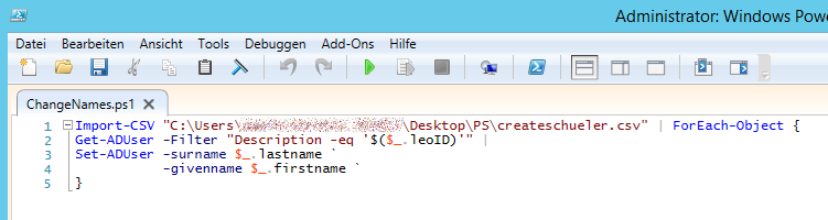 Dummerweise habe ich bei meinem Skript zur Erstellung der Schüleraccounts den Vor- und den Nachnamen vertauscht. Das Skript ist nun angepasst, damit sich dies in den nächsten Jahren nicht wiederholt. Nun musste ich nur noch die letztes Jahr, nach der Änderung zur Lehreroffice ID, erstellten Accounts ändern. Zum Glück hatte ich noch die CSV-Datei mit den Angaben. Das Skript vergleicht die Lehreroffice ID des Benutzers und ändert Vor- und Nachnamen, wenn der Benutzer (leoID) übereinstimmt.