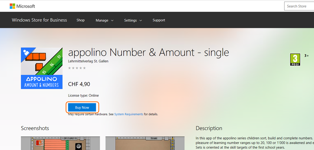 Leider funktioniert die automatische Verteilung kostenpflichtiger Apps mit SCCM nicht. Ich möchte hier am Beispiel von Appolino aufzeigen, wie man die App halt manuell auf die Geräte bringt. Zuerst muss man sie im Businessstore suchen und kaufen.