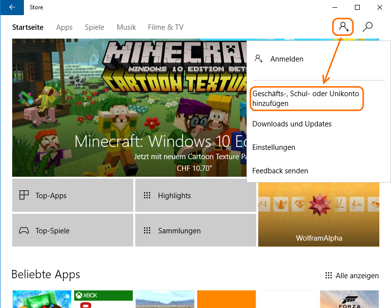 Nachdem die Vorarbeiten oben gemacht sind, muss die App noch installiert werden. Dazu meldet man sich am Gerät an und öffnet den Store. Hier wählt man rechts oben das Symbol für Benutzer hinzufügen und dann “Geschäfts-, Schul- oder Unikonto hinzufügen”.