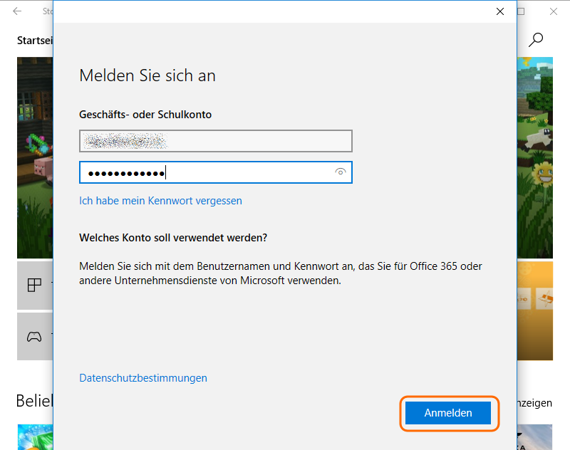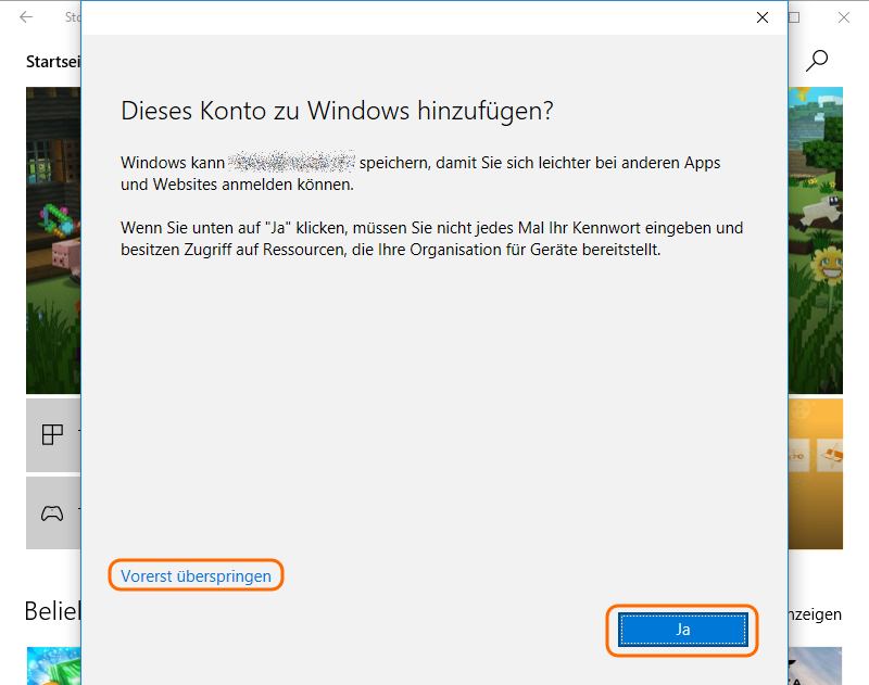 Man kann durch einen Klick auf “Ja” das Konto zu Windows hinzufügen oder man wählt “Vorerst überspringen” um sich nur beim Store anzumelden.