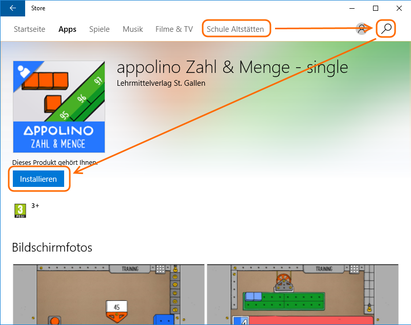 Unabhängig davon wird neu der sogenannte “private store” angezeigt (im Bild unten als zusätzliche Registerkarte “Schule Altstätten”). Wenn man nun nach der App sucht, wird statt dem Preis (und der Möglichkeit zum Kauf) “Installieren” angezeigt. Ein Klick darauf installiert die App.