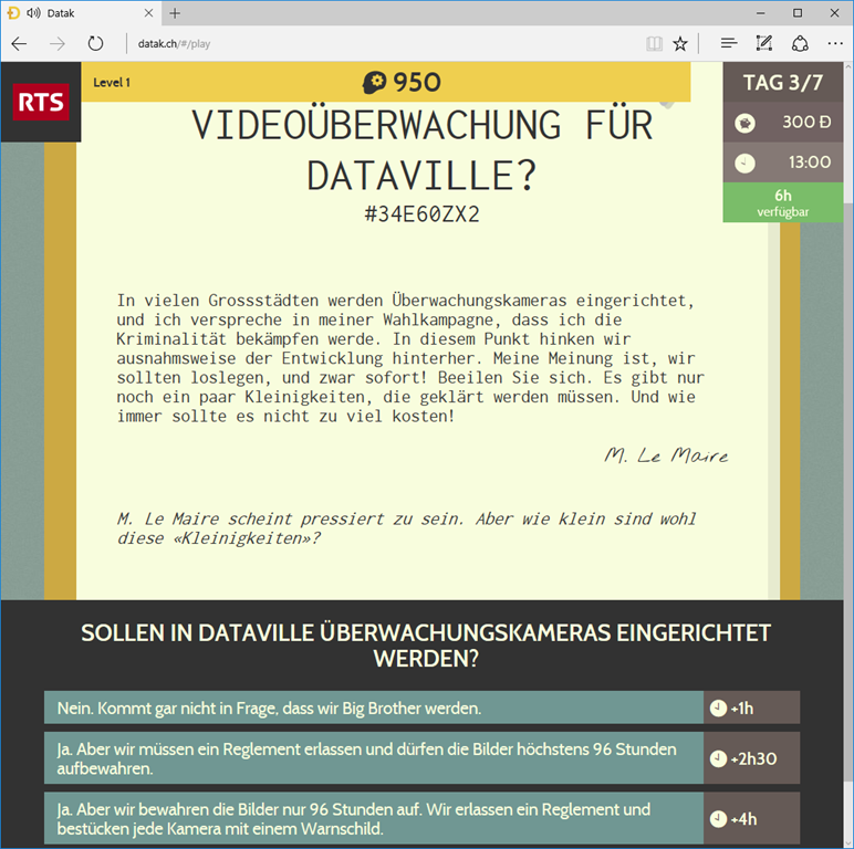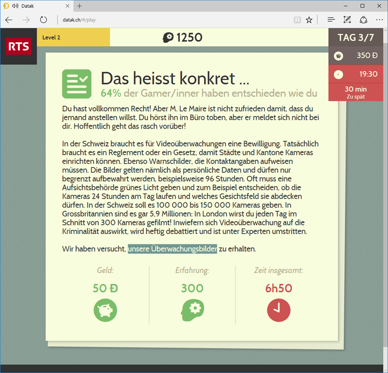 Je nach Antwort muss man mehr Zeit einsetzen und hat dadurch weniger Zeit für anderes zur Verfügung. Wie bei dieser Frage gibt es oft nicht einfach ein “richtig” oder “falsch”, sondern Argumente, die dafür oder dagegen sprechen. Je nachdem, was man antwortet, erhält man mehr oder weniger Geld und Erfahrungspunkte. Ausserdem wird angezeigt, wie viele der anderen Teilnehmer die gleiche Antwort gewählt haben und meist auch ausführliche Hintergrundinformationen zu dem Thema des Dossiers. Manchmal hat es in den Hintergrundinformationen auch noch einen Link zu weiterführenden Informationen. Diese sind dann aber leider meist nur Französisch, da das Spiel ja aus der Welschschweiz stammt.