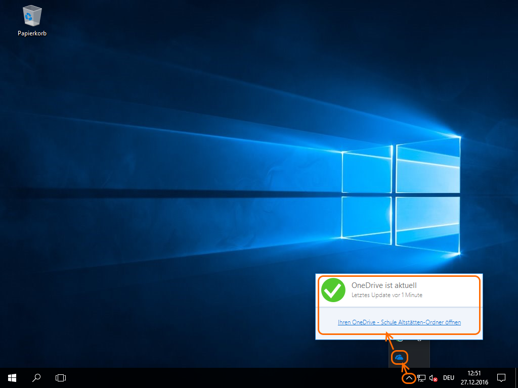 Sobald das OneDrive Konto eingerichtet ist, wechselt das Cloudsymbol von grau zu blau. Wenn man auf das Symbol klickt, erhält man ein kleines Infofenster, das einem den Status der Synchronisierung anzeigt und einen Link zu den synchronisierten Dateien anbietet.