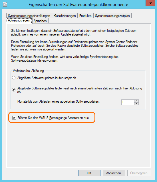 Bei der Recherche zu einem Problem bin ich darauf gestossen, dass der WSUS Server auch gewartet werden muss, wenn man ihn mit SCCM verwaltet. Bei SCCM CB (Current Branch) gibt es eine neue Option, dass der WSUS Bereinigung-Assistent durch den SCCM Server verwaltet wird. Dies genügt aber nicht ganz als regelmässige Wartung.