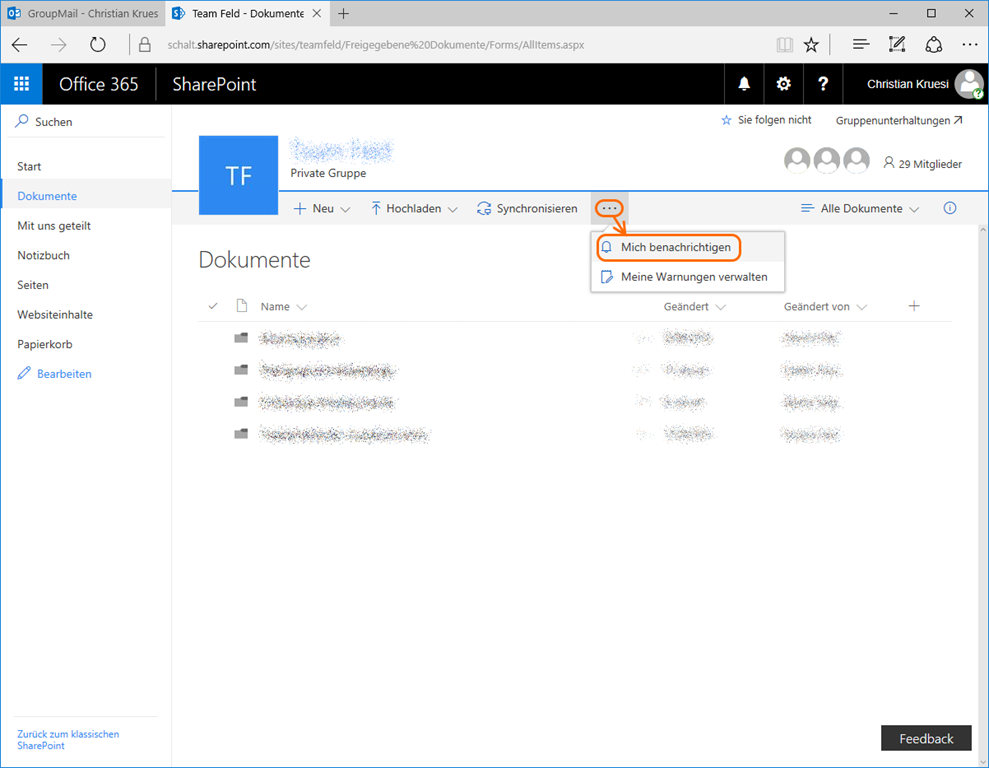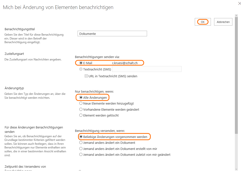 Wenn man also benachrichtigt werden möchte, wenn jemand ein neues Dokument hoch lädt oder eines ändert, kann man “Mich benachrichtigen” wählen und im nächsten Fenster dann die gewünschten Einstellungen wählen.