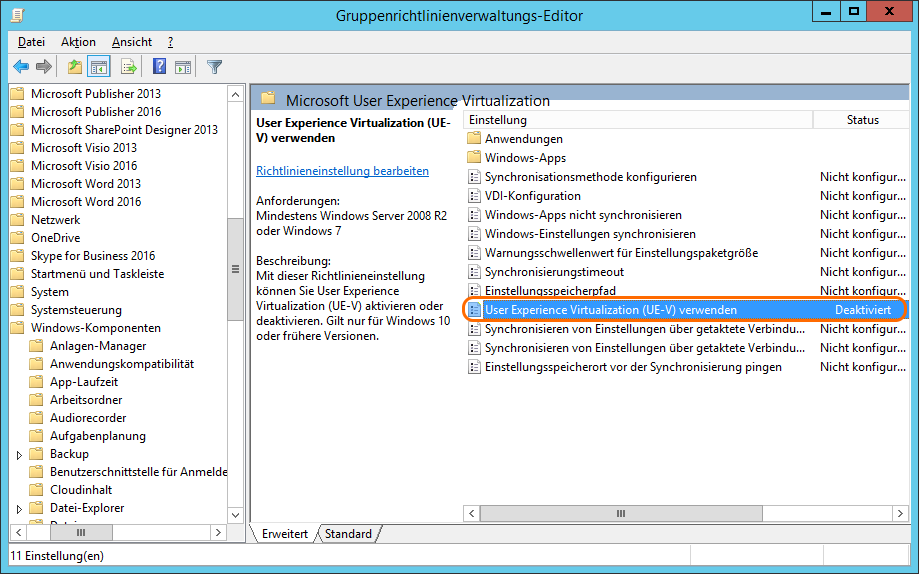 Benutzerkonfiguration –> Administrative Vorlagen –> Windows Komponenten –> Microsoft User Experience Virtualization –> User Experience Virtualization (UE-V) verwenden –> Deaktiviert.