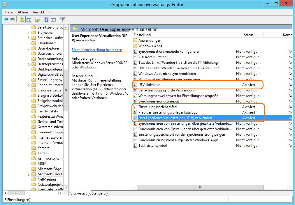 Man kann UE-V über Gruppenrichtlinien, SCCM oder über Powershell/WMI konfigurieren. Aufgrund der Beschreibungen habe ich mich für die Gruppenrichtlinien entschieden.