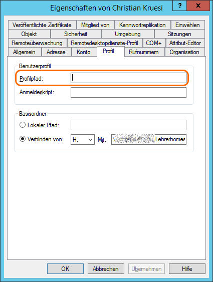 Hier sieht man, dass der Sync noch nicht stattfindet, also kein Problem für die Benutzer. Um nun mit einzelnen Benutzern zu testen, muss man bei diesen den Profilpfad entfernen und sie dann in eine OU verschieben, bei der die Benutzergruppenrichtlinie von oben nicht greift.