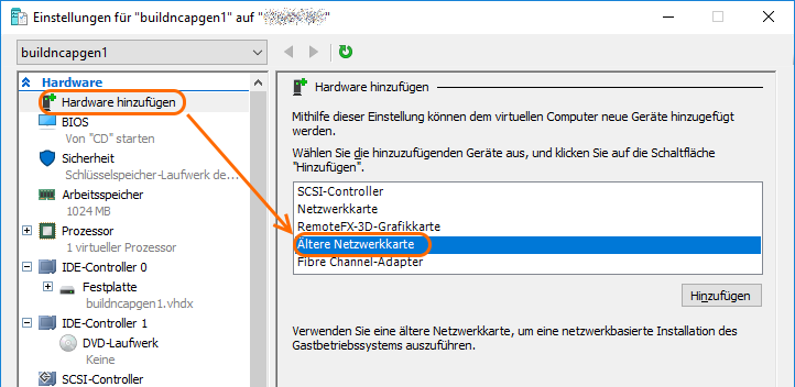 Damit eine Generation 1 Maschine übers Netzwerk (PXE Boot) starten kann, muss man über “Hardware hinzufügen” eine “Ältere Netzwerkkarte” hinzufügen.