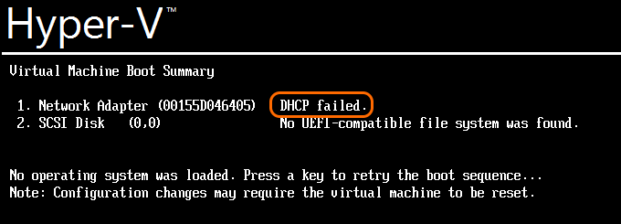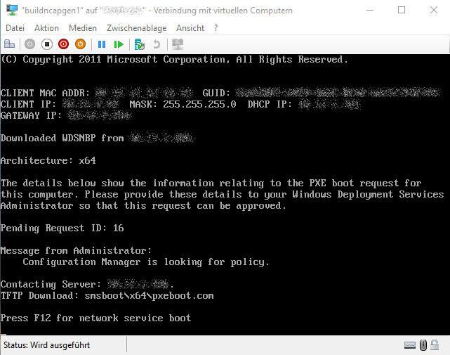 Allenfalls hängt dies damit zusammen, dass mein Hyper-V-Host neu unter Windows 10 1703 läuft, das ja diverse Änderungen in Hyper-V mitbringt. Physische Maschinen funktionieren weiterhin problemlos, es liegt also nicht am Netzwerk, dem DHCP- oder dem SCCM-Server. Ich habe neue Maschinen angelegt, den virtuellen Netzwerkswitch gelöscht und neu erstellt, die Hyper-V Rolle entfernt und wieder hinzugefügt und dann das ganze auch noch mit einem anderen (physischen) Computermodell versucht. Funktioniert bei mir alles nicht. Der einzige Workaround, den ich gefunden habe, ist eine Generation 1 Maschine zu erstellen. (es gibt einen weiteren, vgl. Nachtrag ganz unten).