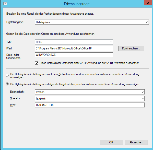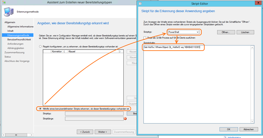 Bei der Erkennungsmethode wählt man “Mithilfe eines benutzerdefinierten Skripts erkennen, ob dieser Bereitstellungstyp vorhanden ist:” und als Skripttyp “PowerShell”. Das entsprechende Skript lautet: