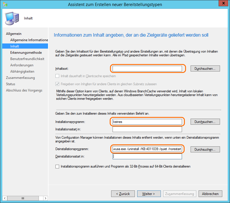 Bei den Einstellungen kann man den Inhaltsort leer lassen. Das Installationsprogramm darf nicht leer sein, da man aber keines benötigt, kann man irgendetwas hineinschreiben. Beim Deinstallationsprogramm wählt man den entsprechenden weiter oben stehenden Befehl.