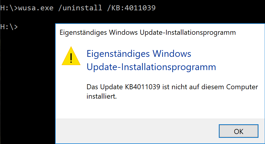 Der Befehl wusa.exe /uninstall /KB:4011039 führt zu der Fehlermeldung, dass das Update nicht installiert sei. In der Systemsteuerung unter “Installierte Updates” wird es aber angezeigt.