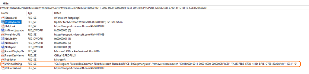 Um ein Office Update zu deinstallieren, muss man zuerst in der Registry nach der KB Nummer suchen. Dort findet man dann den Uninstall String, in meinem Beispiel: