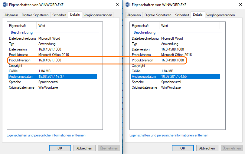 In der Beschreibung zum Update ganz unten sind die Dateien aufgeführt, die eine andere Versionsnummer erhalten. Unter anderem wechselt die Version von Winword.exe auf 16.0.4588.1000. Nach der Deinstallation wird die Version 15.0.4561.1000 angezeigt.