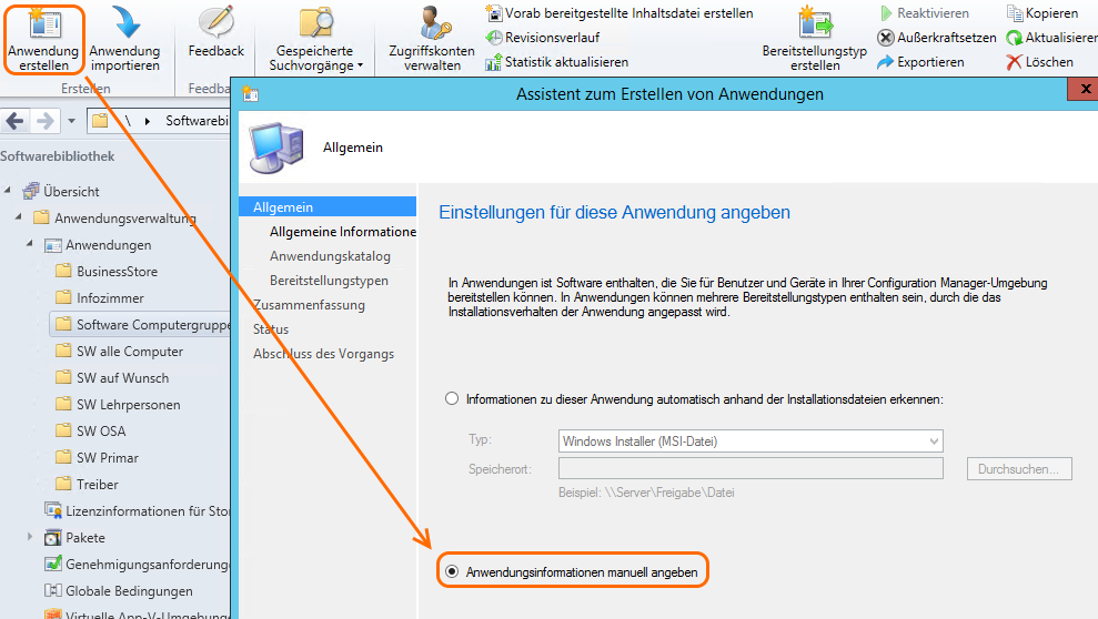 Als erstes kopiert man die Datei auf den SCCM Server. Danach erstellt man eine Anwendung und wählt “Anwendungsinformationen manuell angeben”.
