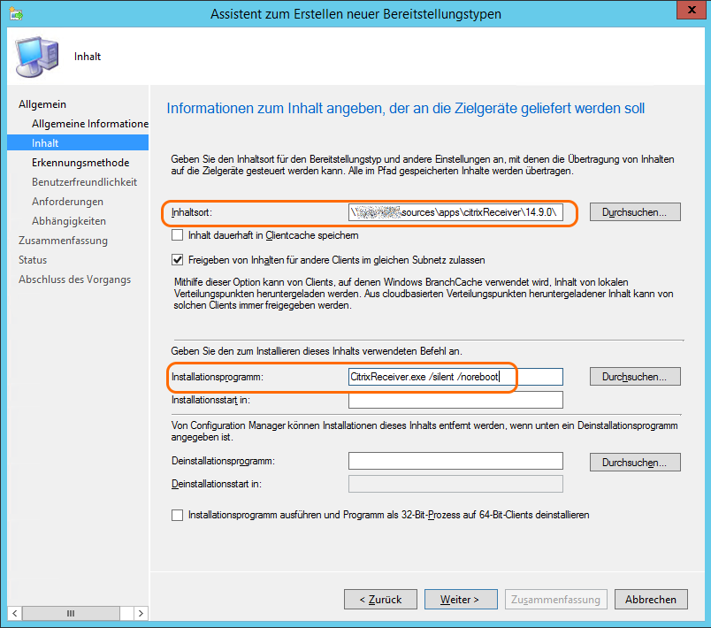 Als Installationsprogramm gibt man “CitrixReceiver.exe /silent /noreboot” an.