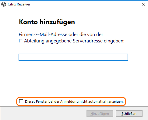 Um VRSG zu benutzen, benötigt man kein Citrix Receiver Konto. Daher kann man beim ersten Start das Häklein bei “Dieses Fenster bei der Anmeldung nicht automatisch anzeigen.” setzen.