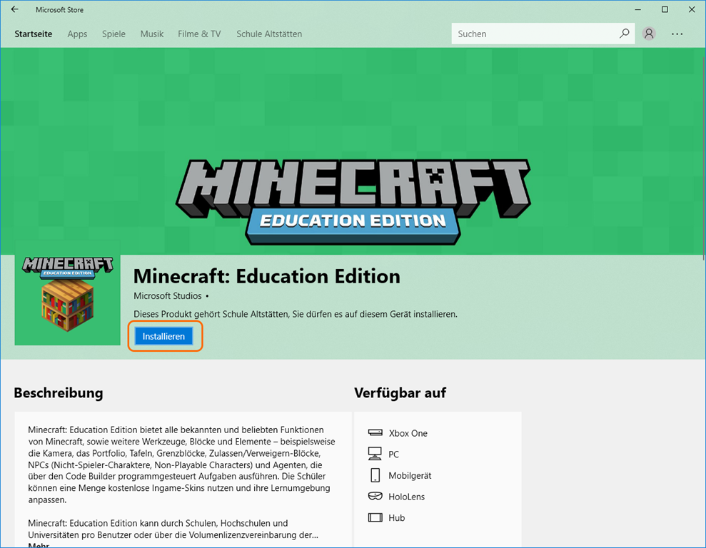 Sobald man sich mit der Schulmailadresse und dem entsprechenden Passwort angemeldet hat, erscheint eine neue Registerkarte “Schule Altstätten”. Dies ist der sogenannte “Private Store” unserer Schule. Hier kann man nun “Minecraft: Education Edition” auswählen…