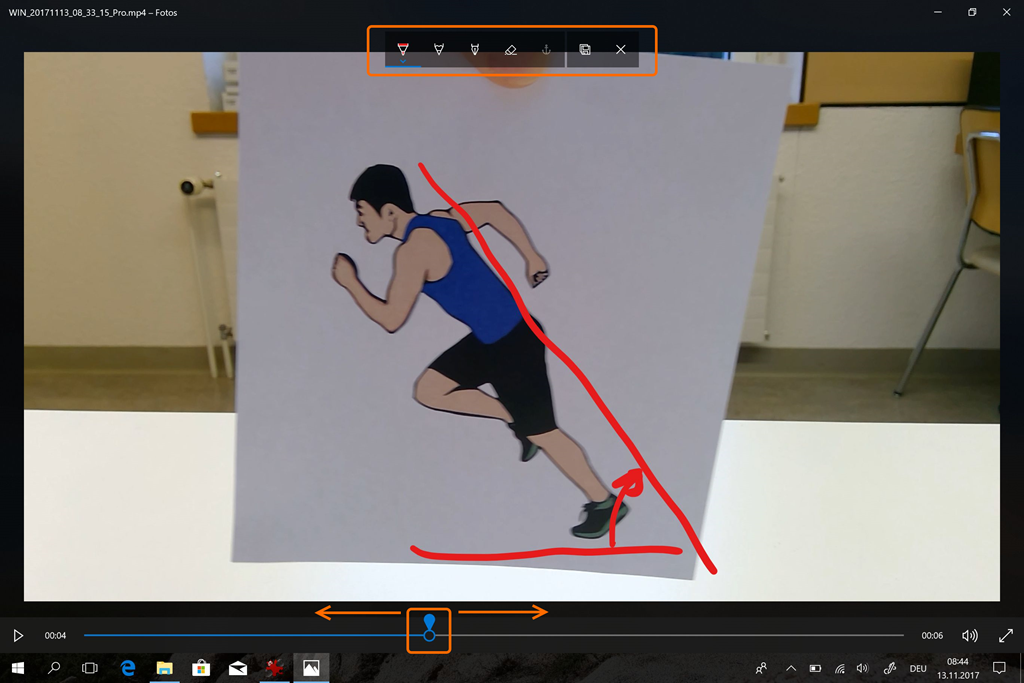 Wenn man die Wiedergabe in der Foto-App pausiert, kann man unten auf der Zeitachse die Wiedergabe vor- und zurückbewegen. Wenn man oben rechts auf “Bearbeiten und Erstellen” klickt, wird eine Leiste mit Zeichenwerkzeugen eingeblendet. Damit kann man in das Bild hineinzeichnen, um bei der Besprechung auf etwas hinzuweisen. Mit dem Ankersymbol lässt sich eine Zeichnung sogar an ein bewegliches Objekt knüpfen.