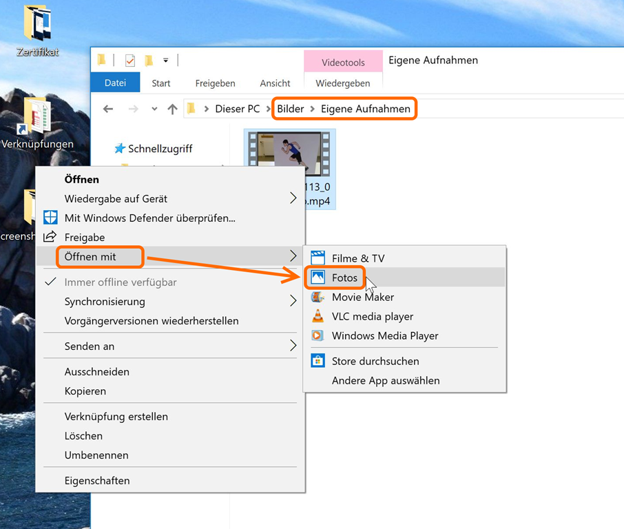 Standardmässig werden die Aufnahmen in den Bilderordner unter “Eigene Aufnahmen” gespeichert. Man kann sie auch von dort starten. Wenn man die Aufnahme dort mit einem Doppelklick startet wird sie mit der App “Filme & TV” gestartet, in der man zwar vor- und zurück spulen aber nicht hineinzeichnen kann. Um auf das Bild zu zeichnen, muss man die Aufzeichnung in der Fotos-App öffnen (z.B. durch Rechtsklick –> Öffnen mit –> Fotos).
