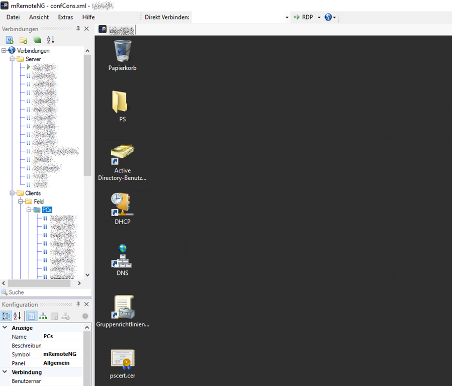 mRemoteNG ist Open Source und passt mir besser als die anderen Tools, die ich bisher eingesetzt habe. Auf der linken Seite kann man seine Verbindungen organisieren. Das Fenster mit den Verbindungen lässt sich auch ausblenden, die Remote Desktop Verbindung skaliert automatisch, auch wenn man das Fenster von mRemoteNG verkleinert oder auf einen zweiten Monitor verschiebt.