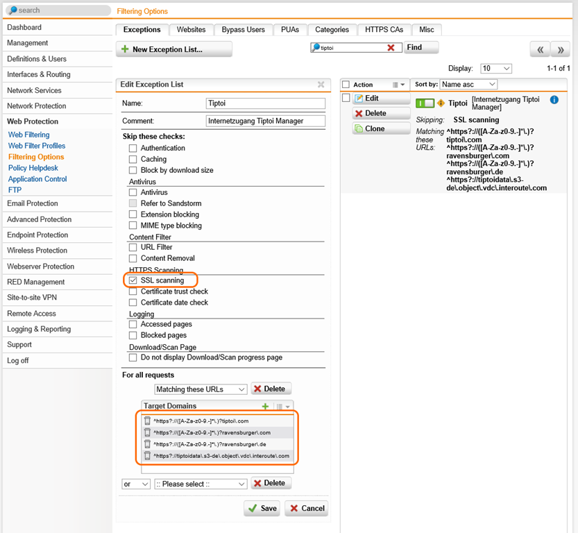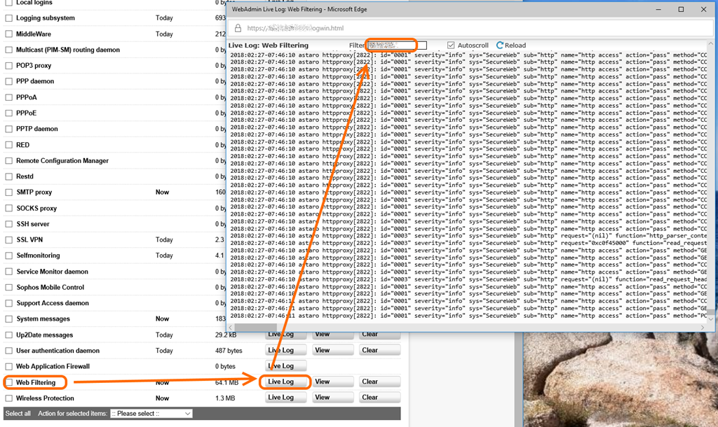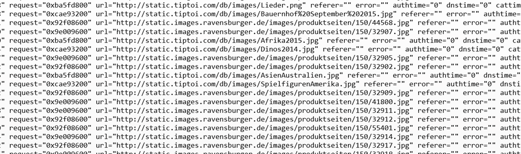 Auf unserer Firewall (Sophos UTM) kann man unter “Logging & Reporting” die verschiedenen Logfiles anschauen. Die Logs zum Contentfilter finden sich unter “Web Filtering”. Wenn man dort auf “Live Log” klickt, sieht man die einzelnen Verbindungen, die vom Web Filtering bearbeitet werden. Dies ist aber völlig unübersichtlich, in einem grösseren Netzwerk werden so viele Verbindungen bearbeitet, dass man keine einzelne Zeile lesen kann. Zum Glück kann man oben bei “Filter” die IP Adresse des Computers mit dem Tiptoi Manager eingeben, dann sieht man nur noch diese Verbindungen.