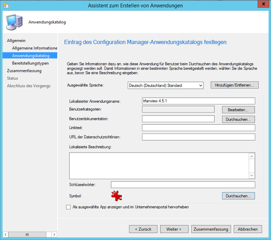 Als nächstes vergibt man den Namen und bei “Anwendungskatalog” kann man noch ein Symbol hinzufügen, dass dann im Softwarecenter angezeigt wird.