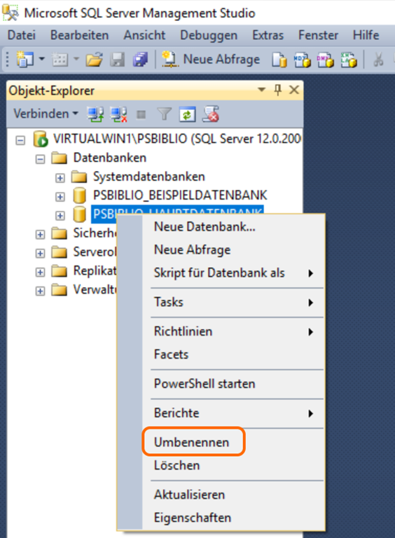 Wenn wir später alle 3 Standorte auf PS-BIBLIO Version 5 migriert haben, können nicht alle 3 Datenbanken gleich heissen, daher benenne ich sie hier um.