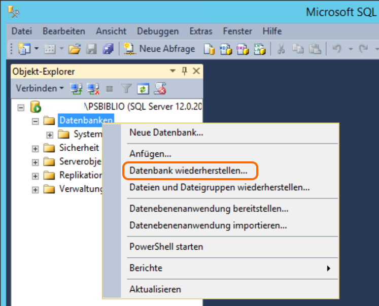Nun muss man auch auf dem Server noch analog zum Client oben das Management Studio installieren und damit die vorher gesicherte Datenbank wiederherstellen.