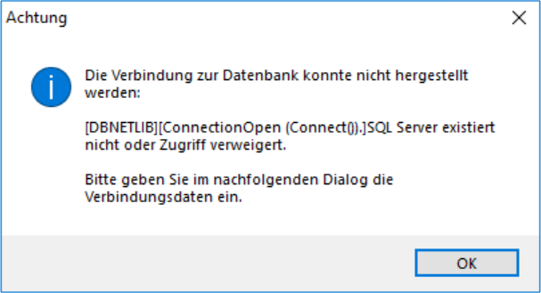 Nach der Installation erhält man eine Meldung, dass die Datenbank nicht gefunden werden konnte.