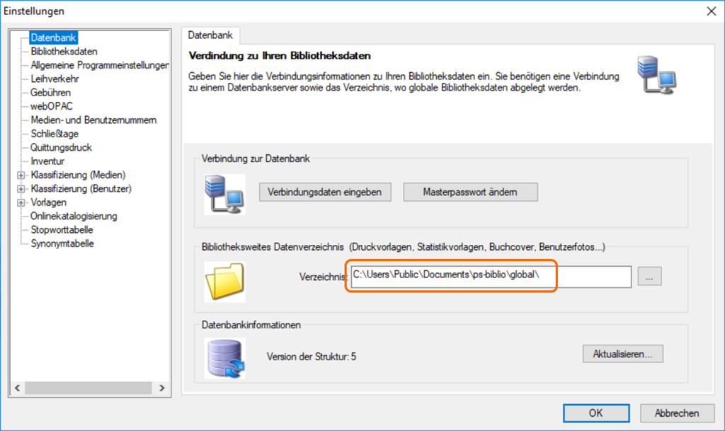 Die bibliotheksweiten Daten kopiert man vom angezeigten lokalen Pfad auf eine Netzwerkfreigabe. Bei einer Einzelplatzinstallation geht es nicht darum, dass man von mehreren Computern auf diese Freigabe zugreifen kann, sondern um das Backup. Auf dem Fileserver wird dieses regelmässig gesichert und man kann den Bibliothekscomputer problemlos neu aufsetzen, ohne dass man Daten verliert.