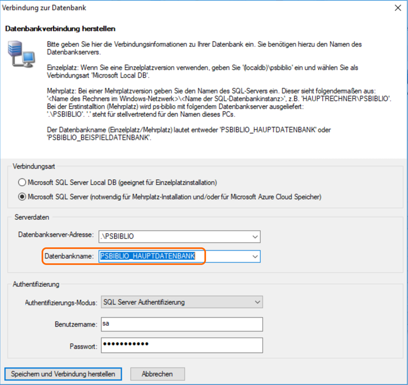 „Zu beachten ist, dass jeder Benutzer mit seiner Windowsanmeldung eine eigene Instanz von LocalDB zugewiesen bekommt. Wenn also auf einem Rechner mehrere Benutzerkonten existieren, ist nicht garantiert, dass jeder Account Zugriff auf die Daten von ps-biblio bekommt. Wir empfehlen LocalDB deshalb nur für den Fall, dass alle Anwender sich mit dem gleichen Account anmelden bzw. dass gar keine Anmeldung erforderlich ist.