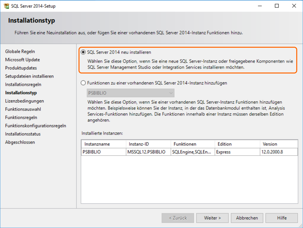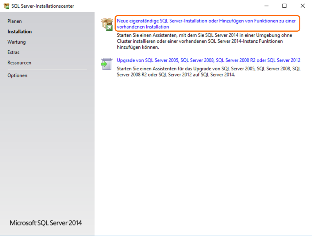 Für den nächsten Schritt benötigt man das “SQL Server Management Studio”. Bei der Installation wählt man “Neue eigenständige SQL Server-Installation…” und dann “SQL Server 2014 neu installieren”.
