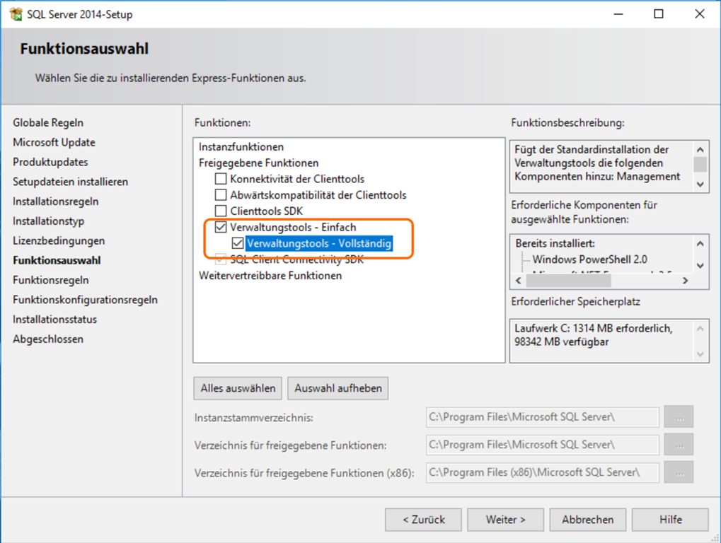 3. SQL Server Express in der empfohlenen Version 2014 auf einem Server installieren