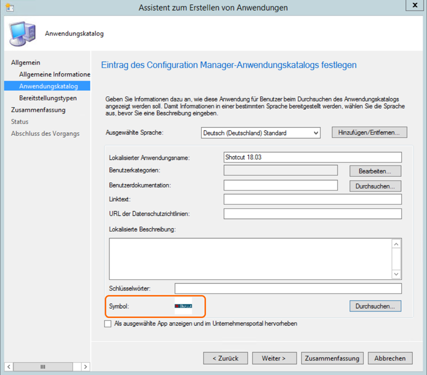 Es ist zwar nicht nötig, aber da sonst nur ein Standardsymbol im Softwarecenter angezeigt wird, wähle ich in diesem Schritt jeweils ein vorher erstelltes Symbolbild.