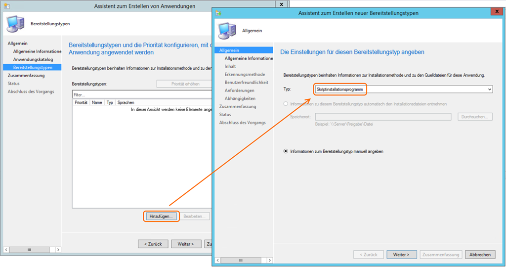 Bei “Bereitstellungstypen” wählt man “Hinzufügen…” und dann “Skriptinstallationsprogramm”.