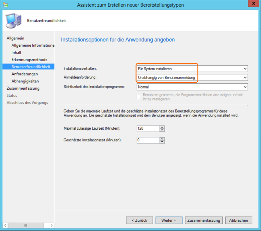 Im nächsten Fenster wähle ich jeweils “Für System installieren” und “Unabhängig von Benutzeranmeldung”.