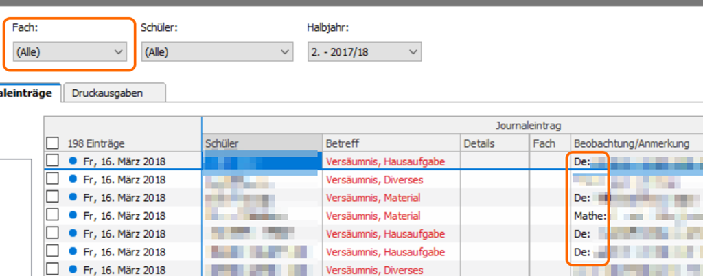 Stattdessen wurde das Fach als Kürzel im Text zum Journaleintrag vermerkt.