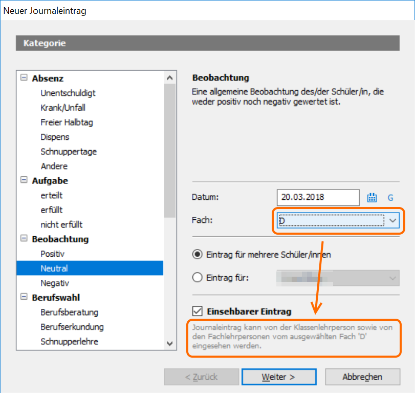 Einzig der Kommentar, der bei einem Journaleintrag unten erscheint, sobald man ein Fach auswählt, stimmt so nicht mehr.
