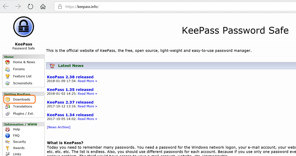 Auf der Seite https://keepass.info/ wechselt man auf Downloads.