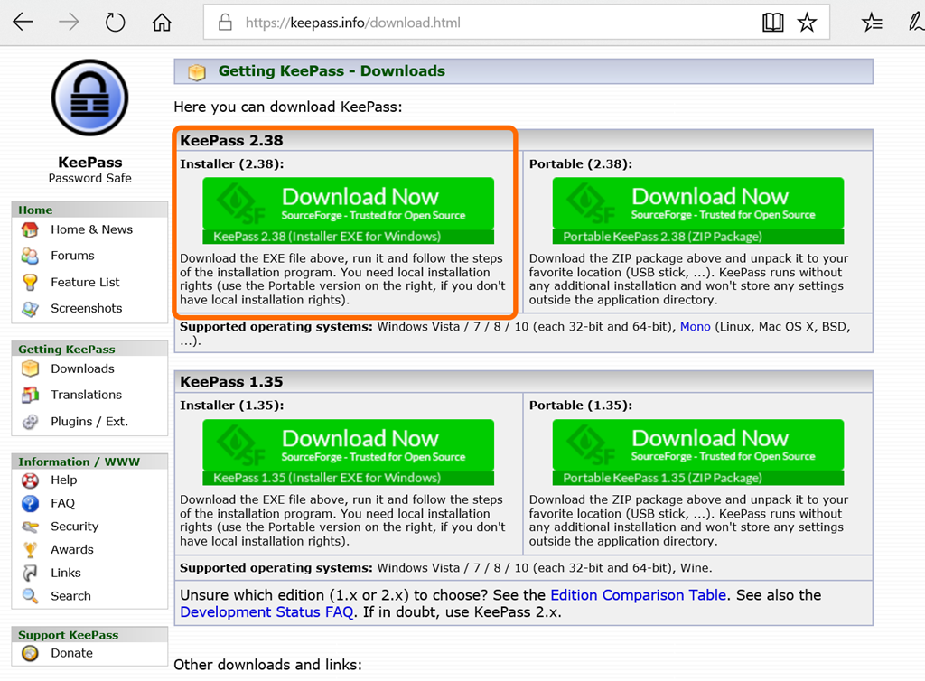Es gibt 4 Versionen von KeePass. Die oberen beiden Versionen sind die neueren. Auf dem eigenen Computer zu Hause empfehle ich den “Installer” links, der das Programm auf dem Computer installiert. Auf einem Computer, auf dem man keine Installationsrechte hat, z.B. auf einem Schul- oder Firmencomputer, kann man die Portable Version verwenden.