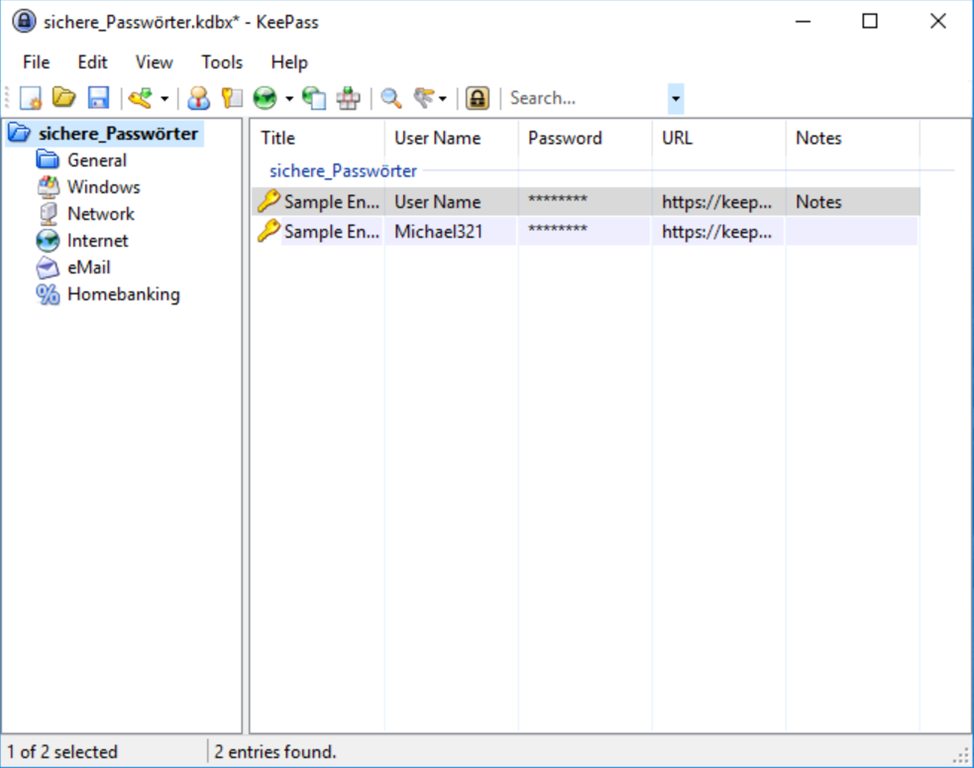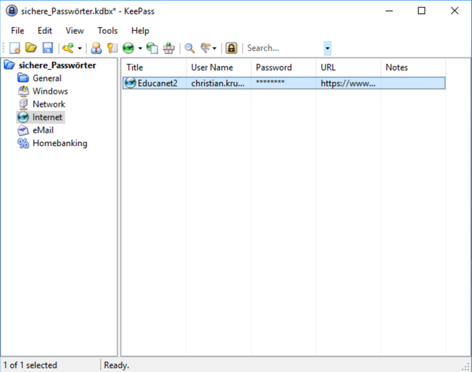 Durch einen Doppelklick auf den Titel eines Eintrags öffnet sich dieser und man kann die Eingaben einsehen. Ein Doppelklick auf “User Name” oder “Password” eines Eintrags speichert den Inhalt in die Zwischenablage. So kann man über Ctrl + V diese sehr praktisch z.B. in die Anmeldemaske eines Online-Dienstes übernehmen.