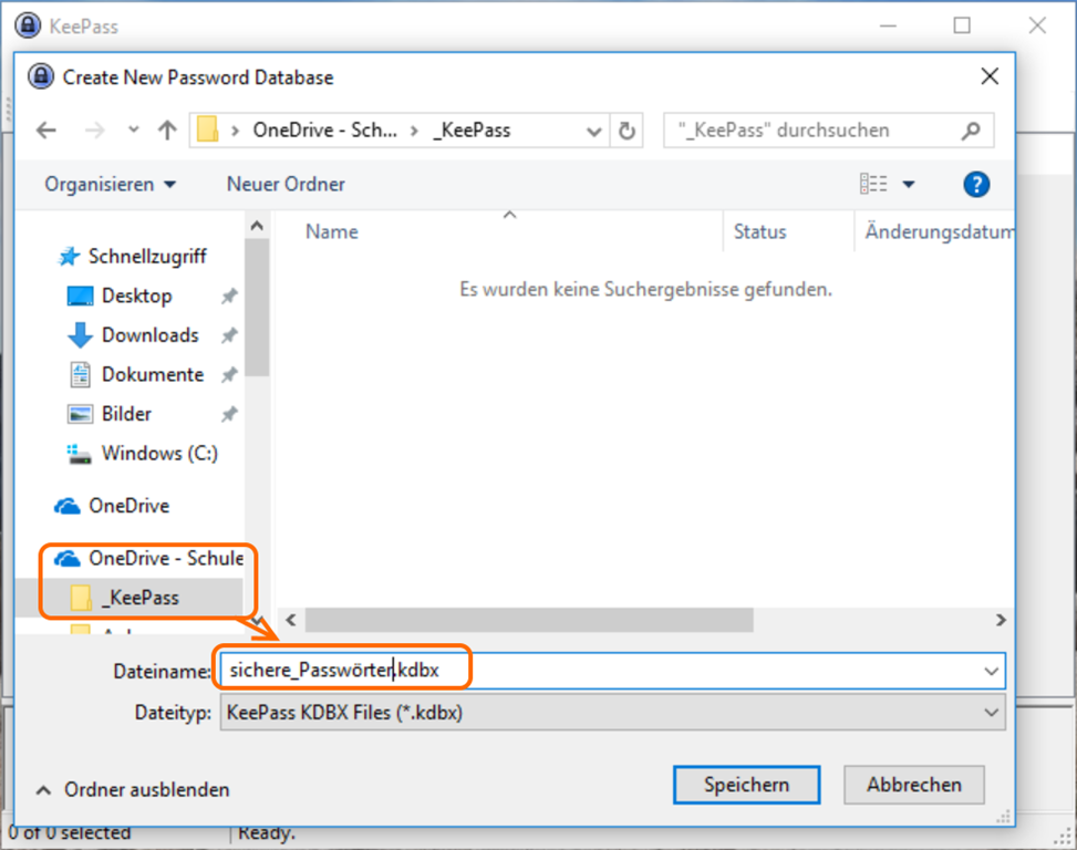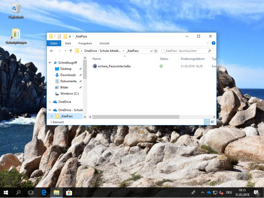 Obwohl die Datei in der Cloud liegt, sind die Passwörter sicher. Weder Microsoft selber, noch ein amerikanischer Geheimdienst der Microsoft zur Herausgabe der Datei zwingt oder ein Hacker, dem es gelingt, in die Microsoft Cloud einzubrechen, kommt an die Passwörter. Der KeePass Tresor wurde ja bei mir auf dem Computer lokal mit nach heutigem Wissen sicheren Verfahren verschlüsselt.
