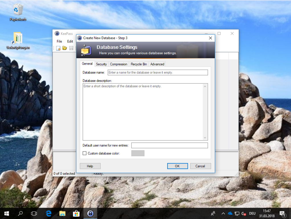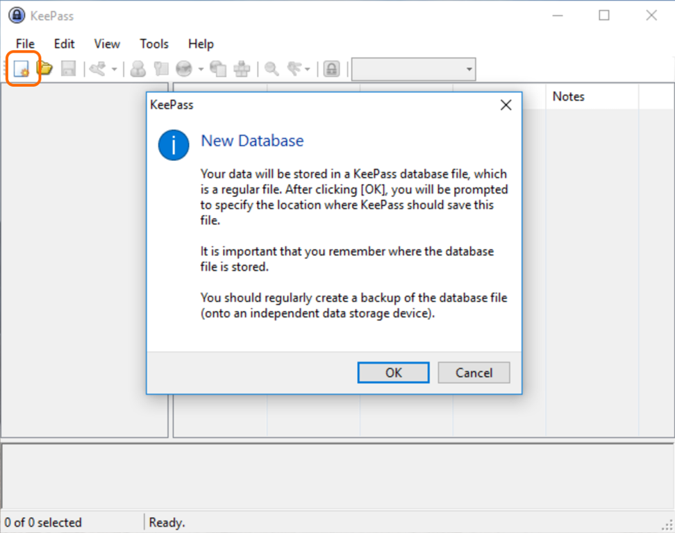 Hier sollte man sich gut überlegen, wo man die Datenbank speichern möchte. Es handelt sich einfach um eine einzelne Datei ähnlich wie ein einzelnes Worddokument. Man kann die Datei zuhause auf dem Computer speichern, dann muss man aber dafür schauen, dass sie regelmässig ins Backup gespeichert wird, das von Vorteil auch noch ausser Haus gelagert wird. Man will ja nicht alle Passwörter verlieren, wenn die Festplatte des Computers den Geist aufgibt oder nach einem Wasser- oder Feuerschaden oder…