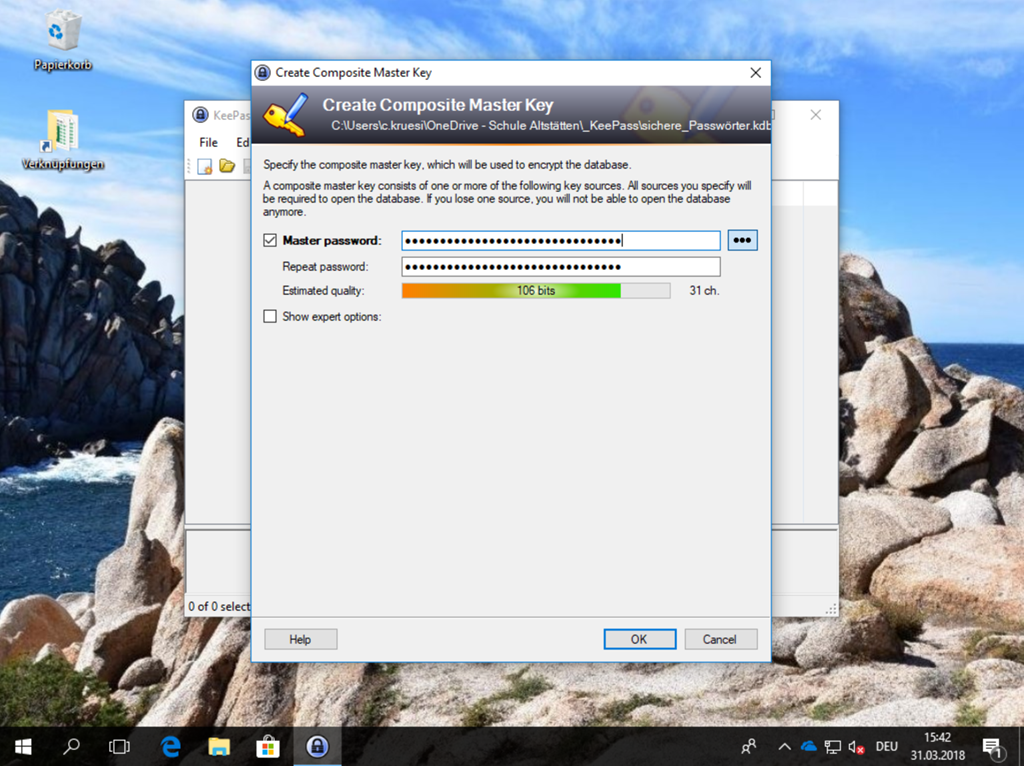 Als nächstes wählt man ein möglichst sicheres “Master password”. Über “Show expert options” könnte man noch sicherere Optionen wählen, z.B. ein Passwort und eine Datei z.B. auf einem USB Stick, die nur beide zusammen den Tresor öffnen können. Darauf verzichte ich aber.