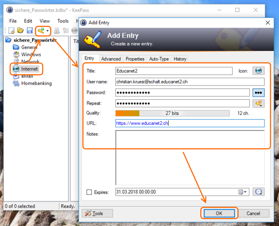Um einen neuen Eintrag zu erstellen, wählt man eine Kategorie (oder erstellt eine neue) und klickt auf das Schlüsselsymbol. Dadurch öffnet sich ein Fenster “Add Entry”, das man nun ausfüllen und mit OK wieder schliessen kann.